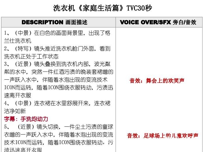 格兰仕洗衣机《家庭生活篇》TVC30秒脚本模板: 脚本是宣传片拍摄的基础,任何宣传片拍摄都要注重脚本的创作。广告视频宣传片拍摄,请联系北京蓝映相文化传媒,咨询电话:15921981329(周)。